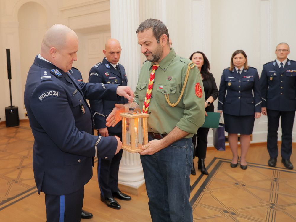 Podczas uroczystości harcerz Chorągwi Stołecznej Związku Harcerstwa Polskiego Maciej Kądzieliński przekazał na ręce Komendanta Stołecznego Policji mł. insp. dr Krzysztofa Ogrońskiego Betlejemskie Światło Pokoju.