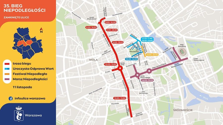 - 35. Bieg Niepodległości (start 11:11): duże zamknięcia tras biegowych od rana, przywracanie ruchu stopniowo po zakończeniu biegu, niektóre odcinki nieprzejezdne do wieczora.