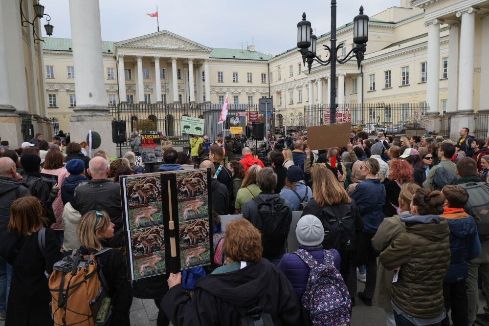 Przeciwnicy odstrzału dzików protestowali pod stołecznym ratuszem