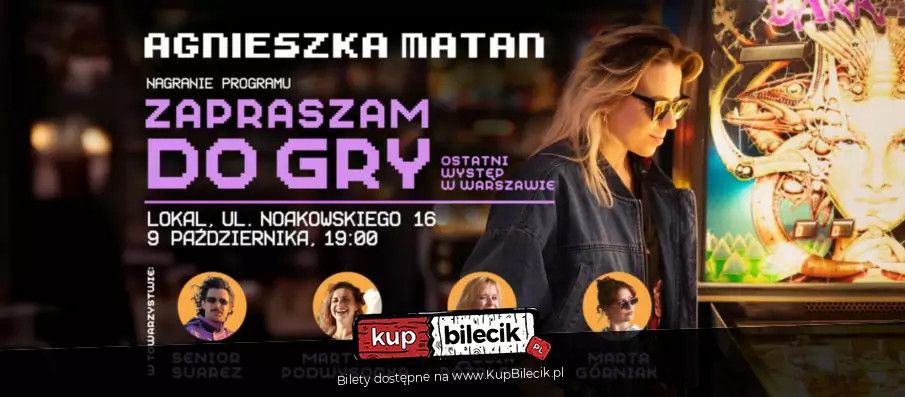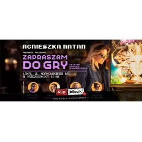 bilety: To pożegnanie programu i nagranie! Więc będą kamery, goście i warto umyć włosy, bo głowy państwa będą na ekranie na wieczność! Wracając do meritum, mam przyjemność zaprosić Was na kolejny zestaw obserwacji kobiety w wieku produkcyjnym, zawieszonej między liceum, a emeryturą. "Zapraszam do gry" to program śmieszny, ale klasycznie, z nutką nostalgii. Opowieść o pewnym studencie, który wykonuje najgorszą pracę świata będzie inspiracją do wielowątkowych dygresji o niezwykłej kondycji społeczeństwa i historii osobistych, tych aktualnych i tych z początku millenium. W programie zostaną poruszone następujące wątki: Stand-up: Agnieszka Matan artyści: Agnieszka MatanAgnieszka Matan to stołeczna komiczka, improwizatorka, stand-up"erka i scenarzystka. Była urzędniczka, miłośniczka taksówek i gazety "Retro". Autorka programów "Halo taxi Bilans trzydziestolatki", "Języki obcych" i "Jesteś u pani". Bywa w Comedy Central i w ogóle w różnych miejscach, bo nie odmawia, jak ktoś ją zaprosi. Działalność internetową uprawia pod pseudonimem Halo Matan. Należy do Kolektywu Śmiesznie. Współtworzy podcast "Koleżaneczki od śmiania i płakania". Od 6 lat prowadzi "Dobre żarty", czyli scenę dla debiutujących komików i komiczek. Nie przepada za harcerzami, siatkówką i butami typu crocks, ale uprawia komedię bez nienawiści, więc jeżeli przyjedziecie po treningu siatkówki, w mundurze i gumowych butach z dziurami, to też jesteście mile widziani. Bilety do nabycia na: KupBilecik.pl |