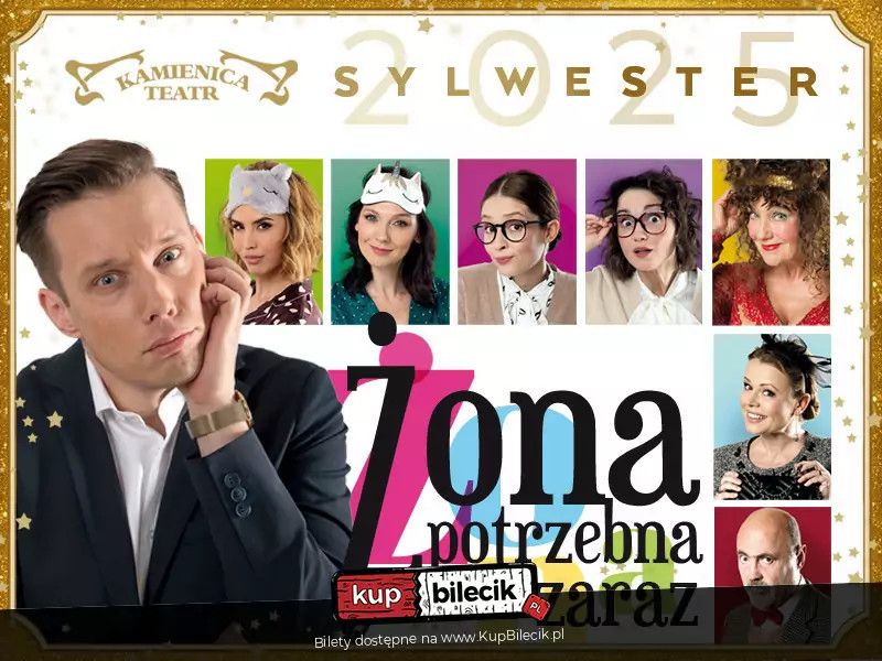 bilety: Jak z przytupem powitać Nowy Rok? Spędź niezapomniany wieczór sylwestrowy w towarzystwie gwiazd, dobrego humoru i teatralnych emocji w samym sercu kulturalnej Warszawy, tj. w Teatrze Kamienica. Na ten wyjątkowy, ostatni dzień roku, przygotowaliśmy wyborną komedię, która wprowadzi Was w szampański nastrój i sprawi, że będzie to niezapomniany wieczór! "Żona potrzebna od zaraz" - Kiedy stawką jest awans, a szef zapowiada wizytę z małżonką - nie ma miejsca na wpadki. Jest tylko jeden problem: brak żony! Co może pójść nie tak, gdy trzeba błyskawicznie zorganizować idealną panią domu? Ta przezabawna, przewrotna komedia Edwarda Taylora w gwiazdorskiej obsadzie to idealny przepis na szampański humor i udane pożegnanie starego roku. Błyskotliwy tekst, świetne tempo i sytuacje, które bawią do łez - Teatr Kamienica zaprasza na sylwestra z uśmiechem szerokim jak Nowy Rok długi! Reżyseria: Tomasz Dutkiewicz Żona potrzebna od zaraz artyści: Maria Pakulnis, Michalina Sosna, Andżelika Piechowiak, Magdalena Wójcik, Marcin Troński i inni"Żona potrzebna od zaraz..." Edwarda Taylora to znakomita, inteligentna komedia pełna błyskotliwego humoru słownego i sytuacyjnego. To gwarancja zabawy pełnej śmiechu oraz odrobiny ironii i uszczypliwości pod adresem każdego z nas. Szczególnie wiarygodna w tak znakomitej gwiazdorskiej obsadzie. Bilety do nabycia na: KupBilecik.pl |