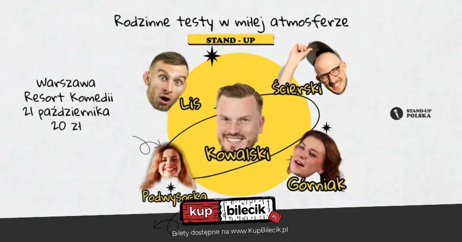 bilety: Testy materiałów stand-up w rodzinnej atmosferze! Normalnie tak smaczne, że prosisz o dokładkę. Albo mówisz: "Dobre, ale więcej nie rób." Poznaj źródło komedii - szlifowanie nowych materiałów, z których część żartów trafi do youtubowych speciali komików, a część wprost do kosza z napisem "zmieszane". A to wszystko za dwie dyszki. Czyli w cenie jednego piwa. Testy materiałów stand-up w rodzinnej atmosferze artyści: Martyna Podwysocka, Marta Górniak, Konrad Lis, Łukasz Kowalski, Paweł ŚcierskiTesty materiałów stand-up w rodzinnej atmosferze! Normalnie tak smaczne, że prosisz o dokładkę. Albo mówisz: "Dobre, ale więcej nie rób." Poznaj źródło komedii - szlifowanie nowych materiałów, z których część żartów trafi do youtubowych speciali komików, a część wprost do kosza z napisem "zmieszane". Bilety do nabycia na: KupBilecik.pl |