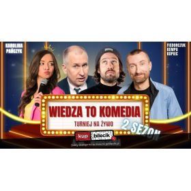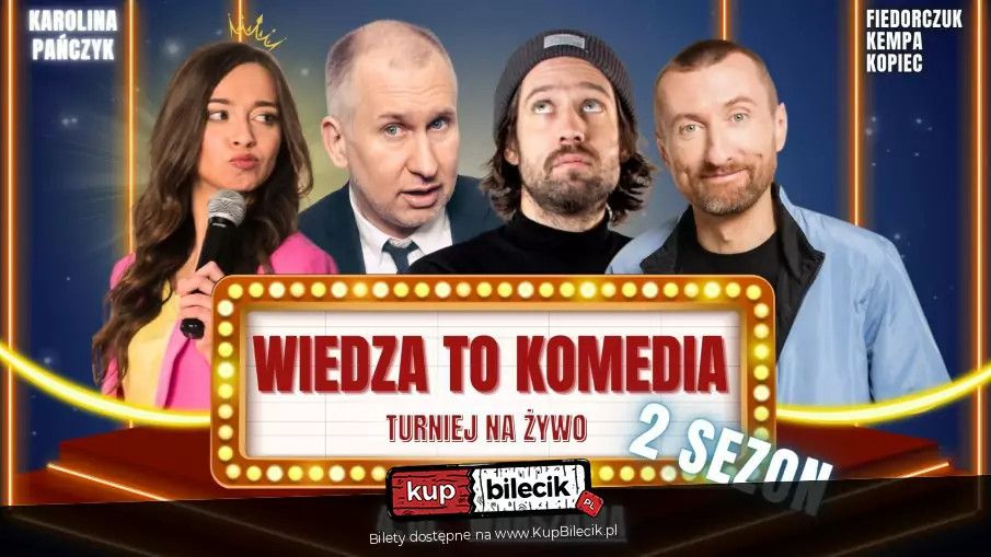 bilety: Turniej komediowy, który pokaże, czy Wiedza To Komedia... sezon II to też nowy prowadzący, czyli Karolina Pańczyk! Przygotujcie się na rewolucję w świecie komedii! W drugim sezonie "Wiedza To Komedia" czeka na Was dawka komediowego rollercoastera! Nowa prowadząca, nowa energia i jeszcze więcej śmiechu! Michał Kempa Wojtek Fiedorczuk Karol Kopiec * Podczas występu obowiązuje zakaz nagrywania audio oraz video. * Osoby przeszkadzające mogą zostać wyproszone bez możliwości zwrotu biletów. * Występ przeznaczony jest dla osób dorosłych. * Nie ma konieczności drukowania biletów, mogą one zostać przedstawione w formie elektronicznej. * Pojawienie się na wydarzeniu po planowanej godzinie startu oznacza brak gwarancji numeru miejsca z biletu. Można będzie zająć miejsce wskazane przez obsługę lub dowolne wolne miejsce na sali. * Wydarzenie może być rejestrowane - biorąc udział w wydarzeniu zgadzasz się na udostępnianie wizerunku przez spółkę Agencja Stand-up Comedy oraz podmioty współpracujące. Bilety do nabycia na: KupBilecik.plWiedza To Komedia - Turniej Komediowy artyści: Komicy i stand-uperzyTurniej komediowy, który pokaże czy WIEDZA TO KOMEDIA! Prowadzący Czarek Sikora - młody stand-uper z Gdańska. Bardzo błyskotliwy, inteligentny, szybki, śmieszny, zajebisty, no po prostu najlepszy... Ten opis, to jego marzenie by ludzie tak o nim mówili. Uwielbia kontakt z widownią, a widownia uwielbia jego (przynajmniej tak by chciał). Bilety do nabycia na: KupBilecik.pl |