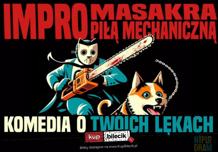 bilety: Impro masakra piłą mechaniczną - Komedia o Twoich lękach. Bilety do nabycia na: KupBilecik.plImpro masakra piłą mechaniczną artyści: NiplodramImpro masakra piłą mechaniczną - Komedia o Twoich lękach. Bilety do nabycia na: KupBilecik.pl |