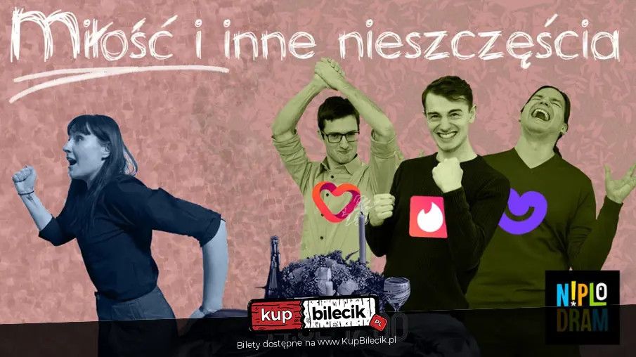 bilety: Zapraszamy na Walentynki z Niplodramem - improwizowany, komediowy spektakl o pechowych randkach, nieudanych prezentach, związkowych wpadkach i złamanych sercach. Czym jest Niplodram? Niplodram to grupa komediowa, która od ponad dekady kręci filmy, pisze skecze i improwizuje na scenie. Ze swoimi pisanymi spektaklami dwukrotnie zdobyli tytuł laureata festiwalu FAMA w kategorii sztuk scenicznych. Ich filmy były doceniane na festiwalach filmów krótkometrażowych, m.in. zdobyli główną nagrodę Grand Video Awards w kategorii "Rozrywka i komedia" oraz trzykrotnie byli do niej nominowani. Występowali na głównych scenach największych festiwali impro w Polsce, a sztuki improwizacji uczyli się od trenerów z całego świata, m.in. z USA, Wielkiej Brytanii, Niemiec, Francji oraz Australii. Zagrają dla Was: Maciej Pawłowski, Filip Stysiak, Kajetan Zakrzewski, Amanda Łażewska i Juliusz Roszczyk. Na pianinie: Stanisław Rekosz. Bilety do nabycia na: KupBilecik.plNiplodram artyści: Grupa komediowaNiplodram to grupa komediowa, która od ponad dekady kręci filmy, pisze skecze i improwizuje na scenie. Ze swoimi pisanymi spektaklami dwukrotnie zdobyli tytuł laureata festiwalu FAMA w kategorii sztuk scenicznych. Ich filmy były doceniane na festiwalach filmów krótkometrażowych, m.in. zdobyli główną nagrodę Grand Video Awards w kategorii "Rozrywka i komedia" oraz trzykrotnie byli do niej nominowani. Występowali na głównych scenach największych festiwali impro w Polsce, a sztuki improwizacji uczyli się od trenerów z całego świata, m.in. z USA, Wielkiej Brytanii, Niemiec, Francji oraz Australii. Bilety do nabycia na: KupBilecik.pl |
