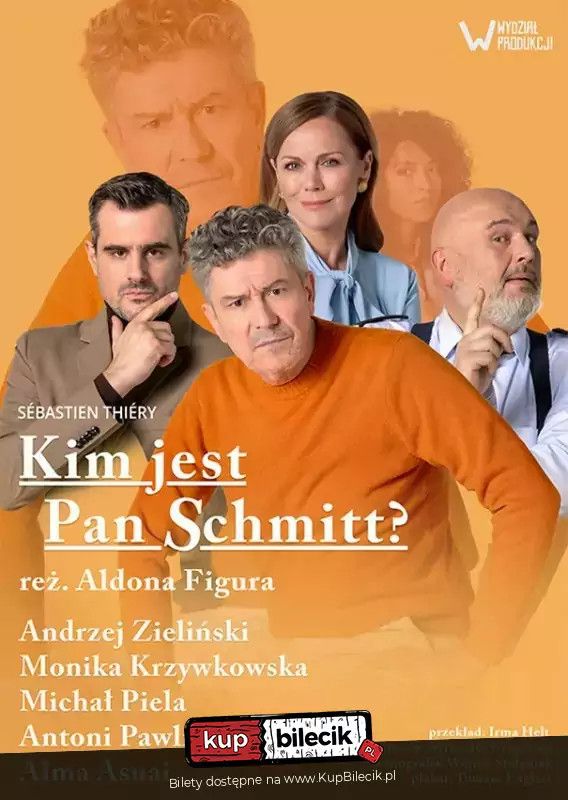bilety: Pewnego dnia poukładane i spokojne życie bohatera sztuki Kim jest pan Schmitt? Sebastiana Thierry"ego zostaje wywrócone do góry nogami. Odkrywa, że jest kimś zupełnie innym, ma inny zawód, inne ubrania i książki w mieszkaniu, on i żona inaczej się nazywają, a nawet mają dorosłe już dziecko. Świat w osobie Policjanta i Lekarza próbuje mu wmówić, że jest panem Schmittem, więc bohater sztuki lawiruje, udając kogoś, kim nie jest, a jednocześnie usiłując nie zdradzić samego siebie i w to, co wierzy. Mnożą się przez to zabawne, absurdalne, a czasem groźne sytuacje i nieporozumienia. Czy istnieją granice kompromisu, na jaki człowiek zdolny jest pójść dla świętego spokoju? Do czego można się posunąć w imię ładu społecznego? Jak długo i do jakiego stopnia można robić teatr z własnego życia? Autor: Sebastian Thiery Kim jest Pan Schmitt? - to więcej niż komedia artyści: Andrzej Zieliński, Monika Krzywkowska, Michał Piela, Antoni Pawlicki, Alma AsuaiWyobraź sobie sytuację, w której budzisz się rano i odkrywasz, że jesteś kimś zupełnie innym niż dotychczas. Z taką sytuacją mierzy się bohater kultowej komedii Sébastiena Thiéry"ego. W lawinie zaskakujących i zabawnych sytuacji, "Pan Schmitt" będzie musiał odpowiedzieć sobie na jedno, bardzo ważne pytanie: Kim naprawdę jestem? Bilety do nabycia na: KupBilecik.pl |