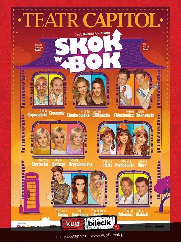 bilety: Dwie pary z długoletnim stażem planują kolejne wspólne wakacje. Ta sama willa, te same atrakcje, no i oczywiście niestety partner także ten sam. Aby więc tym razem urlop nie był nudny, mężowie postanawiają urozmaicić sobie letni wypoczynek i namówić żony do spędzenia wakacji oddzielnie. Tylko jakich argumentów powinni użyć, by ich chytry plan się ziścił? Ich obawy są jednak przedwczesne. Szybko okazuje się, że pań wcale nie trzeba do tego pomysłu przekonywać... Jak zamierzają ten urlop spędzić mężowie? A w jaki sposób będą wypoczywać ich małżonki? I na koniec - najważniejsze pytanie! Dlaczego wybór miejsca docelowego ma aż tak ogromne znaczenie? Skok w bok artyści: Dorota Chotecka, Jacek Kopczyński, Robert Wabich, Joanna Moro, Magda Wróbel i inniDwie pary z długoletnim stażem planują kolejne wspólne wakacje. Ta sama willa, te same atrakcje, no i oczywiście niestety partner także ten sam. Aby więc tym razem urlop nie był nudny, mężowie postanawiają urozmaicić sobie letni wypoczynek i namówić żony do spędzenia wakacji oddzielnie. Bilety do nabycia na: KupBilecik.pl |