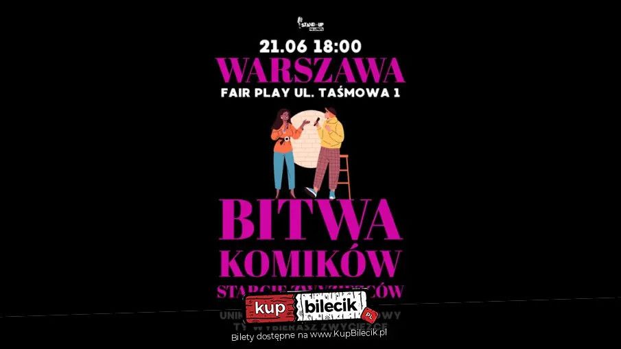 bilety: Legendarne show komediowe z nową edycją w Warszawie! Jesteście gotowi na potężny turniej komediowy?! Z każdej edycji mamy po jednym laureacie, każdy z nich zdobył miłość publiczności oraz nagrodę pieniężną, teraz czas na finałowe starcie i rekordowo duże wydarzenie! Bitwa Komików to format fascynujący, który przypadł do gustu publiczności jeszcze parę lat temu, dzięki czemu wielokrotnie wypełnialiśmy sceny komediowe aż po brzegi! Bitwy Komików odbywały się w takich miejscowościach jak Siedlce, Kraków, Legionowo, Lublin, Poznań, Gdańsk oraz Białystok! Wystąpią sami świetni profesjonalni doświadczeni komicy - partnerzy Stand-up No Limits oraz uczestników show Kanału Komediowego. Komicy będą odkrywani stopniowo, ale obiecujemy, że będą to istne tuzy komedii! - Artur Jakubowicz - Aleksander Olo Mokros - Szymon Marchewka - Dominik Bienias - TBA Wydarzenie poprowadzi: Sergiej Nowikow - międzynarodowy komik, obywatel Polski, od 2021 na scenie, support kilku komików, laureat kilku konkursów, twórca kilku show, najlepszy komik z Siedlec (i/bo jedyny), wzrost 185 cm, rozmiar buta 43. Bilety do nabycia na: KupBilecik.plStand-up Bitwa komików: Wielki Powrót artyści: Komicy i stand-uperzyBitwa Komików to format fascynujący, który przypadł do gustu siedleckiej publiczności jeszcze parę lat temu, dzięki czemu pięciokrotnie wypełnialiśmy kultowe "pantofle" aż po brzegi! Bitwy Komików odbywały się także w takich miejscowościach jak Kraków, Lublin, Poznań oraz Białystok! Bilety do nabycia na: KupBilecik.pl |