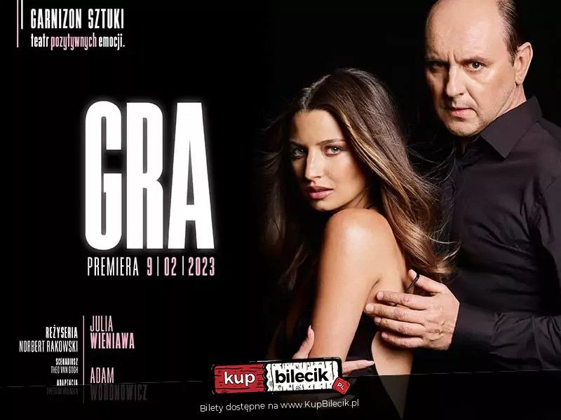 bilety: Julia Wieniawa i Adam Woronowicz w spektaklu pt. "Gra". "Gra" to pojedynek dwóch niezwykłych osobowości. To emocjonująca, przebiegła gra, pełna napieć i zagadek walka bez reguł, w której nic nie jest oczywiste. W rolach głównych zaskakujący aktorski duet, który na długo zapadnie w pamięci: Julia Wieniawa i Adam Woronowicz. Gra artyści: Adam Woronowicz, Julia Wieniawa„Gra” to pojedynek dwóch niezwykłych osobowości. W rolach głównych zaskakujący aktorski duet, który na długo zapadnie w pamięci: Julia Wieniawa i Adam Woronowicz. To emocjonalna, przebiegła gra pełna napięć i zagadek walka między kobietą i mężczyzną, walka bez reguł, w której nic nie jest oczywiste. Gra to niezwykle atrakcyjny i wyjątkowy tekst, który burzy klisze naszego stereotypowego myślenia. Różnice społeczne i obyczajowe zacierają się, bo w Grze nic nie jest czarne ani białe, nie ma przegranych ani zwycięzców. Jest za to dialog, który zmusi do refleksji każdego widza. Sztuka Gra (tytuł oryginału Interview) to adaptacja scenariusza filmowego holenderskiego reżysera Theo van Gogha. Bilety do nabycia na: KupBilecik.pl |